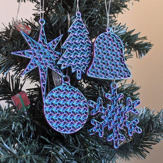 Elegant 3D Printed Ornament Set of 5 - Festive Holiday Decorations, Christmas Tree, Snowflake, Bell, Ball, Star